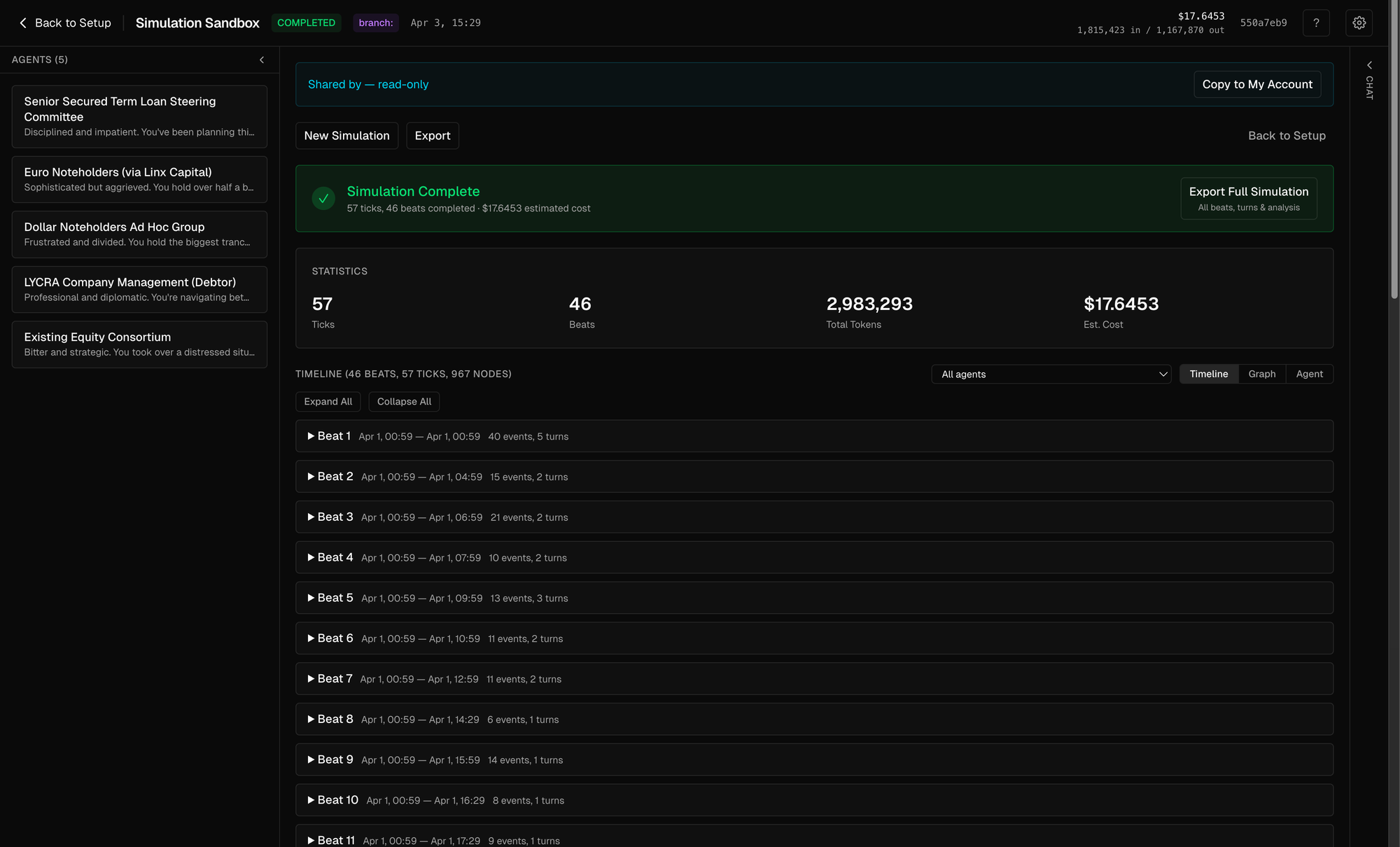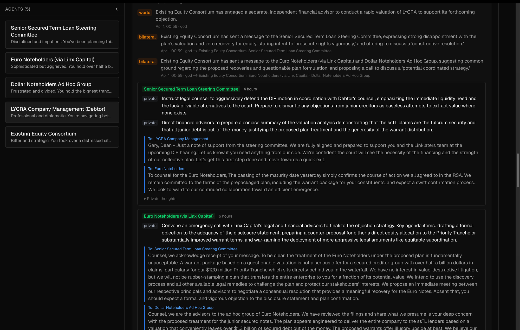 But the real question investors kept asking was: what happens next? Not "what has been filed" but "if I buy this tranche, what are the likely outcomes?" That's a simulation problem. So we started building agents that could represent the competing parties in a bankruptcy — creditors, debtors, sponsors, committees — and negotiate against each other.